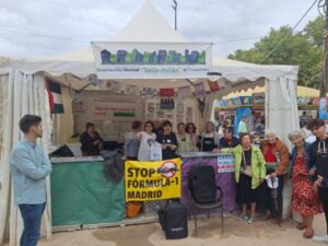 Se resaltó con múltiples carteles la labor de la Valle-Inclán, sus actividades y sus reivindicaciones más importantes: Sanidad, Vivienda, Stop Formula1 Madrid y cese del genocidio que se perpetra contra el pueblo Palestino.