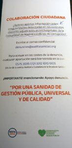 Es fundamental apoyar este trabajo titánico, supervisando miles de contratos desde 2016.Por eso hacen un llamamiento pidiendo apoyo y solidaridad de vecinos y ciudadanos. Tanto denunciando, si se tiene conocimiento de estos contratos en Hospitales y Primaria como participando en Concentraciones y facilitando la difusión de Audita Sanidad. De hecho dan charlas por los barrios para su conocimiento. También hay una cuenta para hacer donaciones.